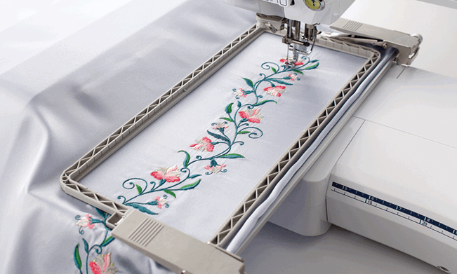 Rammer til at lave fortløbende/sammensatte broderier i lange baner langs kanten af en dug e.lign.